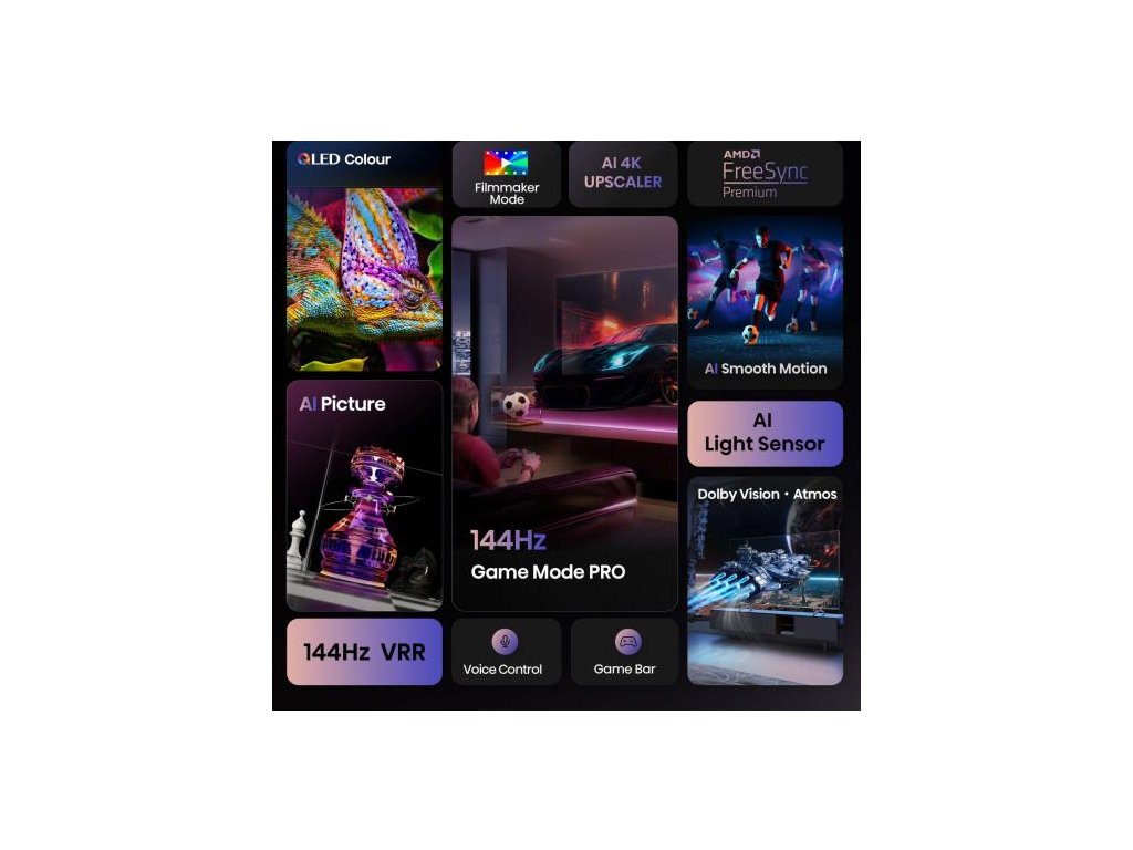Díky funkci 4K AI Upscaler bude mít jakýkoli sledovaný obsah čistou podobu kvality 4K, čímž promění všední věci v nevídané vizuální zážitky. O plynulost obrazu se stará technologie MEMC. Procesor s umělou inteligencí dokáže rozpoznat rychle se pohybující objekty a rekonstruovat jednotlivé pixely pro zachování plynulosti obrazu.